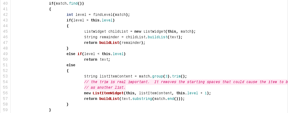 Martin writes that ‘the proper use of comments is to compensate for our failure to express ourself in code.’ It’s there to shout out about something that the code fails to tell you. The comment needs some help to distinguish itself from the surrounding code and say, ‘hey, I’m important!’ Notice that the comment in Martin’s book is appropriately in boldface. Now, let’s look at that same code on GitHub’s code viewer:
