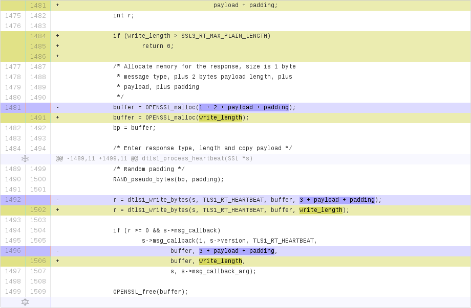 But we don’t live in a world without revision control. It is peculiarly ironic that the ‘deletion is dangerous’ sermon is being delivered by our version control systems. That same revision control system which tells us that ‘it’s okay to delete things, because it’s all still there in the history.’ In reality, insertion/deletion is orthogonal to good/bad. There are good insertions, good deletions, bad insertions, bad deletions. Only we humans get to judge which changes are good and which are bad, but during code review, the diff viewer is constantly subtly trying to influence our judgment. It should be getting out of our way, using neutral colors to distinguish insertions from deletions but make no value judgement about them. Here is GitHub’s diff viewer showing part of the fix to the Heartbleed bug: